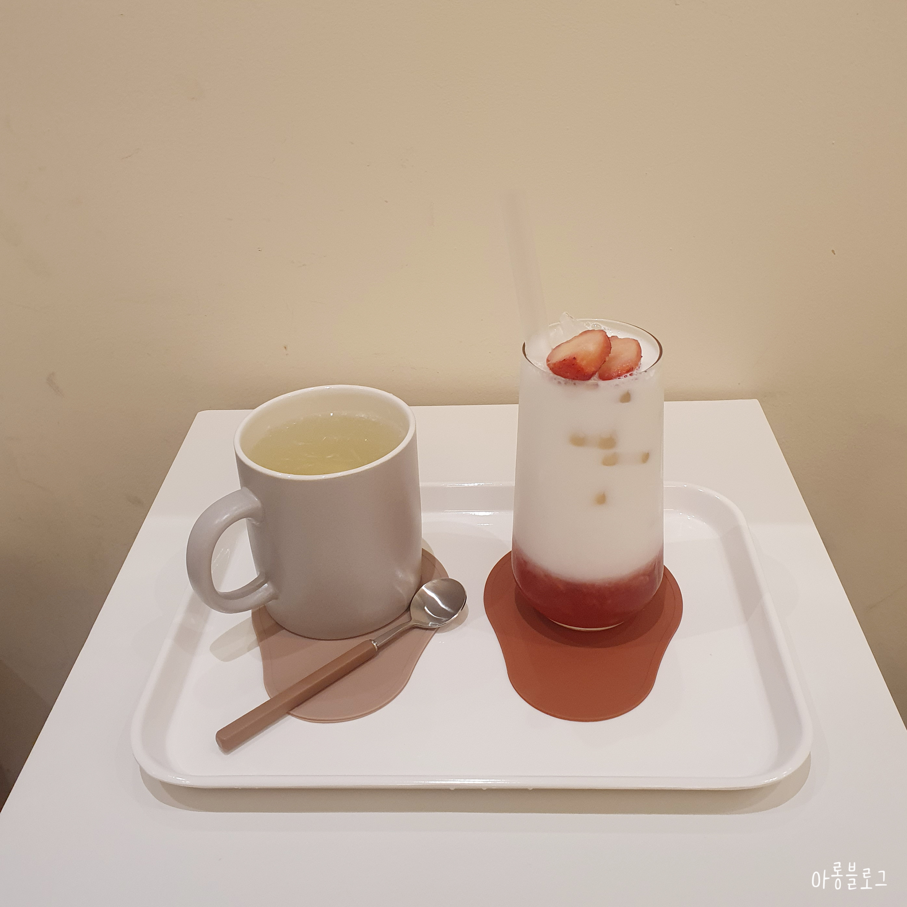 따뜻한 레몬차와 딸기라떼 주문!