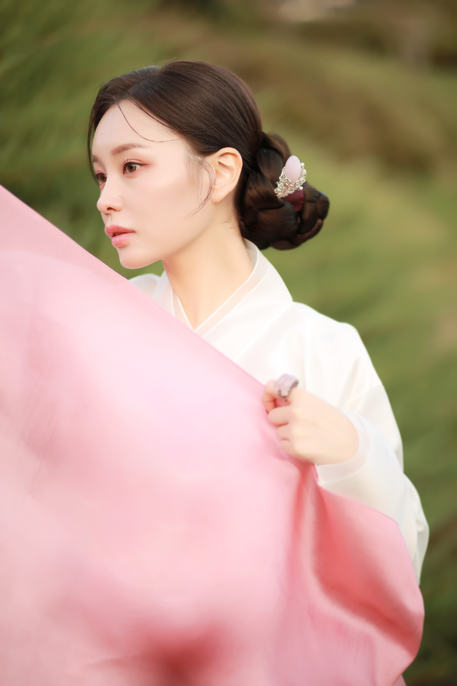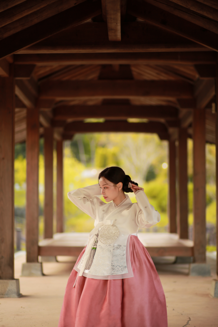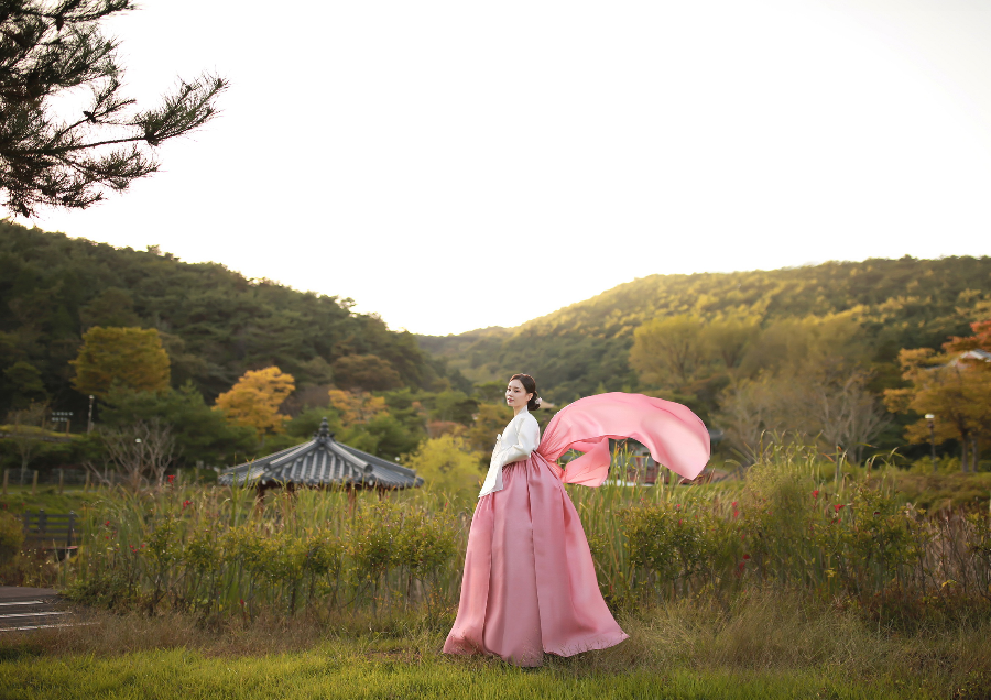 자연과 한옥을 배경으로 본한복의 고급스러운 한복과 함께