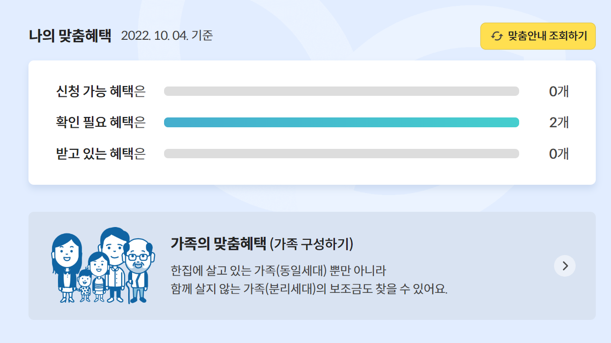 우선 보조금24란, 우리 가족이 받을 수 있는 국가보조금을 한번에 검색해 한눈에 확인하고 신청할수 있는 맞춤형 서비스예요. 14세 이상인 가족구성원이 사전 동의 후 가족 맞춤안내 조회를 하면 한 집에 살고 있는 가족(동일세대) 뿐만 아니라 함계 살고있지 않은 가족(분리세대)의 보조금도 찾을 수 있고 현재 받고 있는 보조금과 향후 받을 수 있는 혜택들도 정리해줘요.