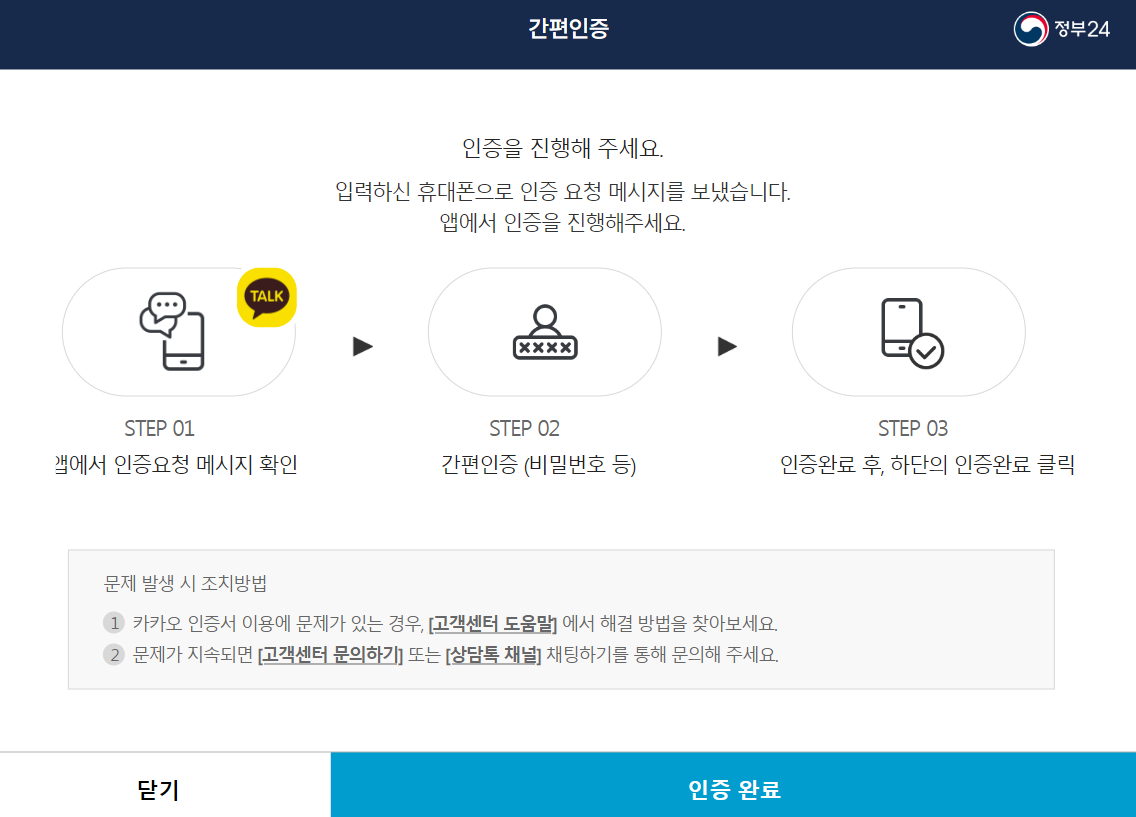 본인에게 맞는 로그인을 진행해주세요. 전 간편인증 중 카카오로 로그인을 해봤어요. 카카오로 인증시 핸드폰으로 카톡을 들어가 인증을 해준 뒤 다시 컴퓨터 화면 에 인증완료를 눌러주면 되요. 이 후 이용약관에 모두 동의를 눌러 주고 다음 단계로 이동합니다.