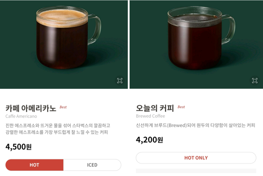 tall사이즈 기준으로 아메리카노보다 오늘의 커피가 300원 저렴하지만 오늘의 커피는 HOT으로만 주문이 가능해요. 아이스로 주문시 가격은 아메리카노와 동일하고 오늘의 커피 아이스버전인 아이스커피는 일부매장에서 판매되지 않으니 스타벅스 앱, 사이렌 오더로 해당메뉴와 지점선택하면 미리 팜매여부를 확인할 수 있어요.