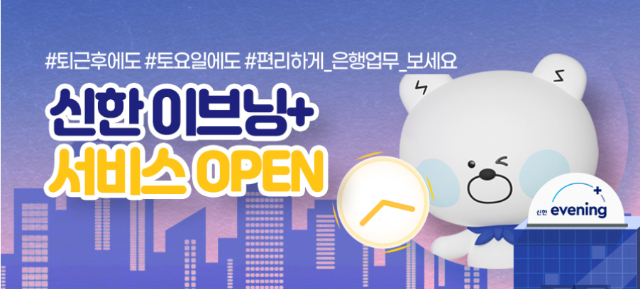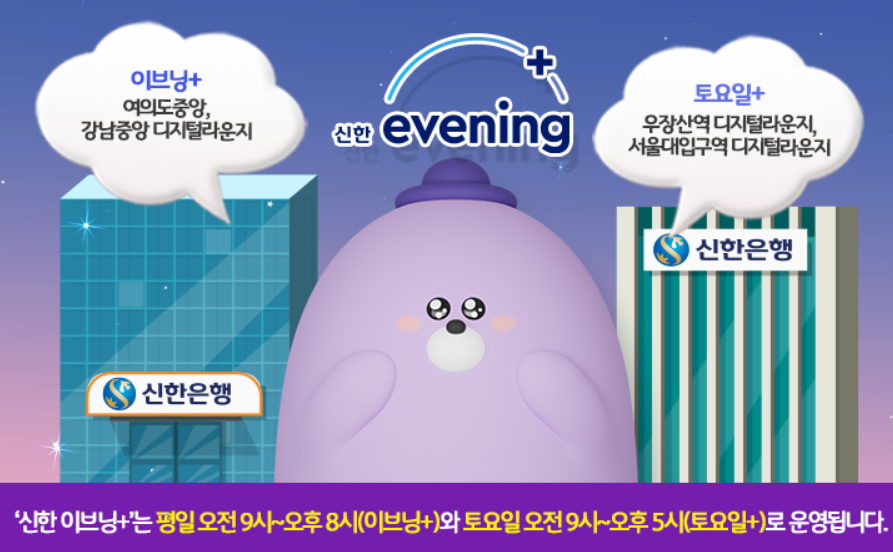신한은행은 평일 저녁과 토요일까지 은행 업무를 볼 수 있게 '신한 이브닝 서비스'를 운영한다.