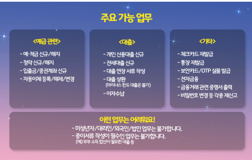디지털라운지에서는 디지털 데스크를 통해 신규 예적금가입, 상담 및 신청등 개인금융업무가 가능하고. 향후 대면창구와 동일한 수준까지 업무 영역을 확대항 방침이다. 참고로 미성년자/대리인/외국인/법인업무와 종이서류작성이 필수인 업무는 불가하다.