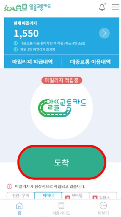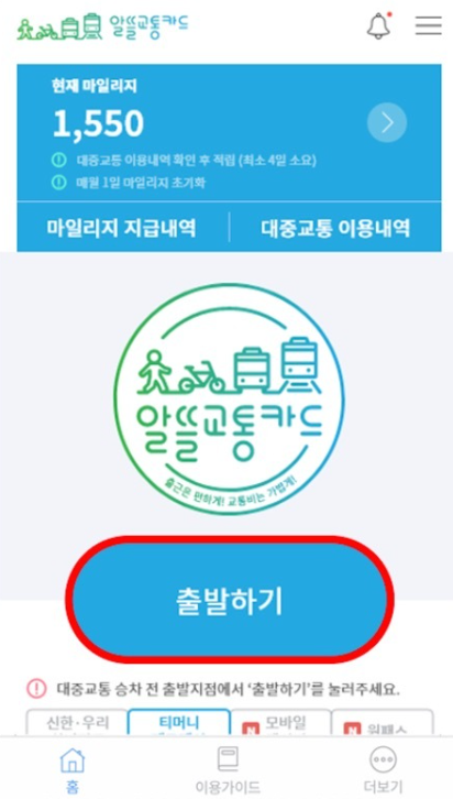 1.출발지에서 알뜰교통카드 앱 실행 후 출발 버튼을 누른다.