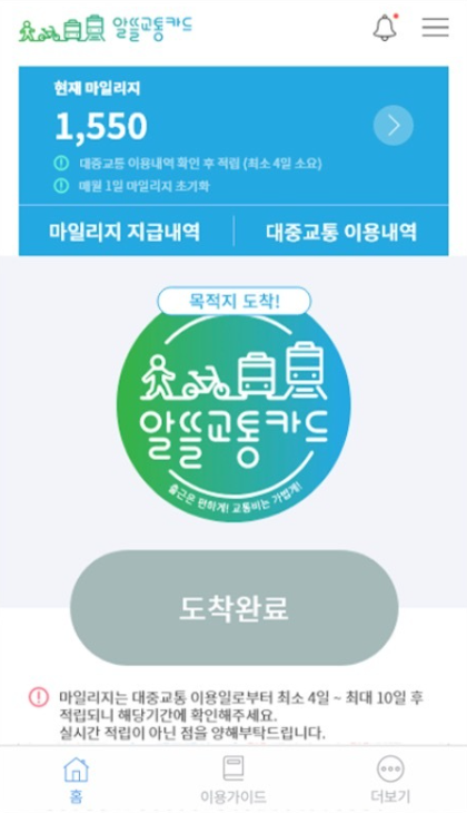 출발지에서 대중교통 타는 곳 거리, 대중교통에서 도착지의 이동거리만큼 책정 및 적립되는 방식이다.