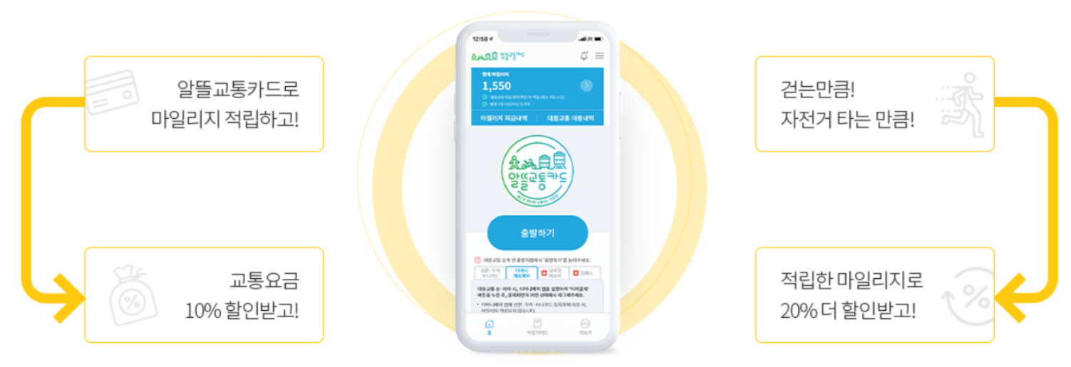 대중교통을 이용하는 분들이 걷거나 자전거로 이동한 거리만큼 마일리지를 적립하는 알뜰교통카드.