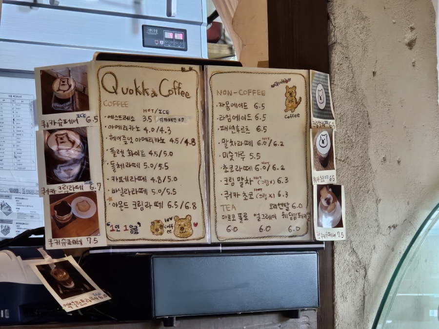 음료들부터 디저트들까지 쿼카그림으로 귀엽게 꾸며져 있어