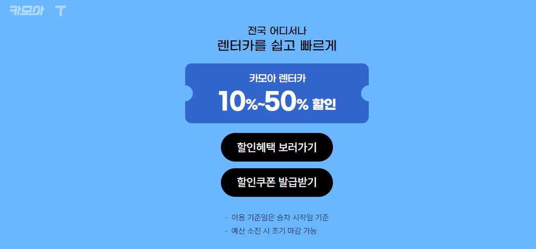 카모아 앱, T맵을 통해 렌터카 예약 시 전국 렌터카 50% 할인