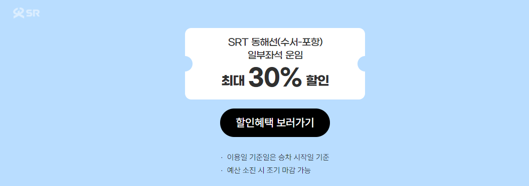 SRT앱 또는 홈페이지 접속 후 포항역 출발/도착 SRT 승차권 예매시 최대 30% 할인