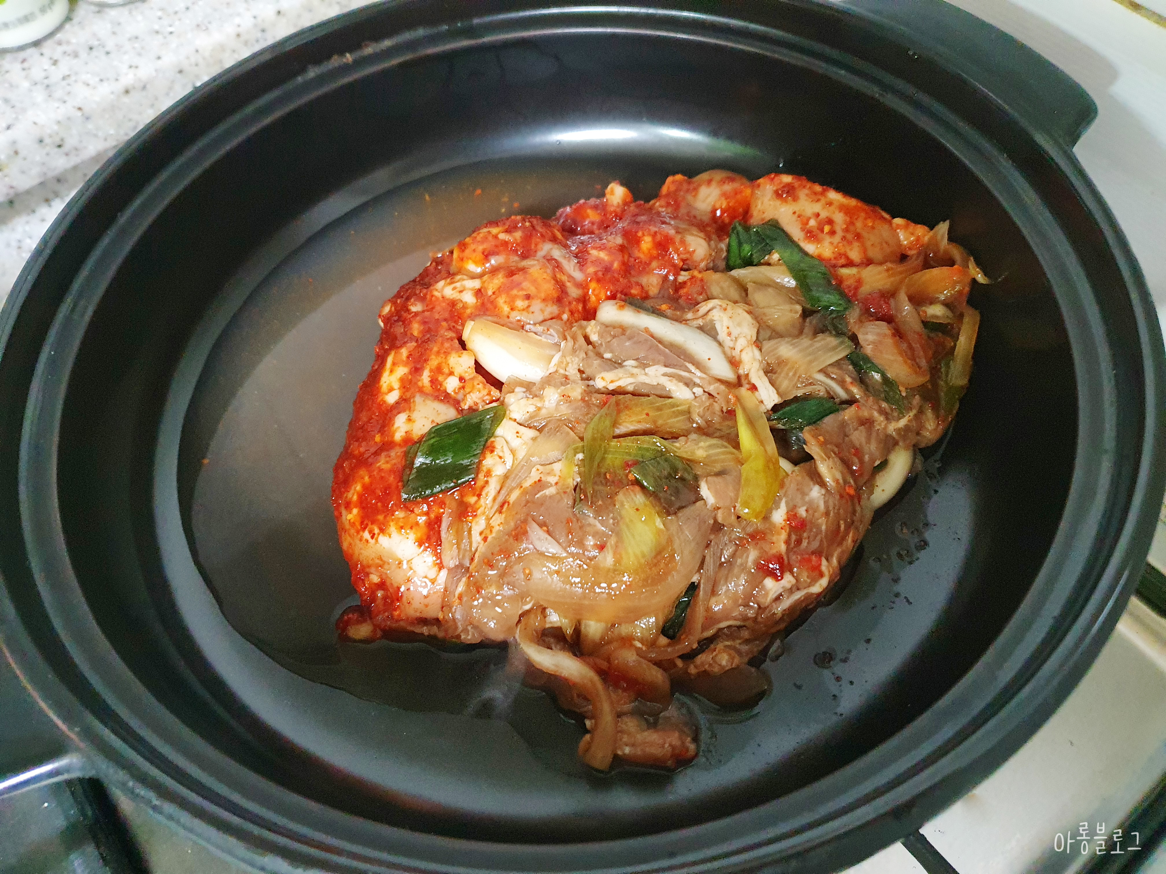 냄비에 대창불고기와 육수를 조금!
