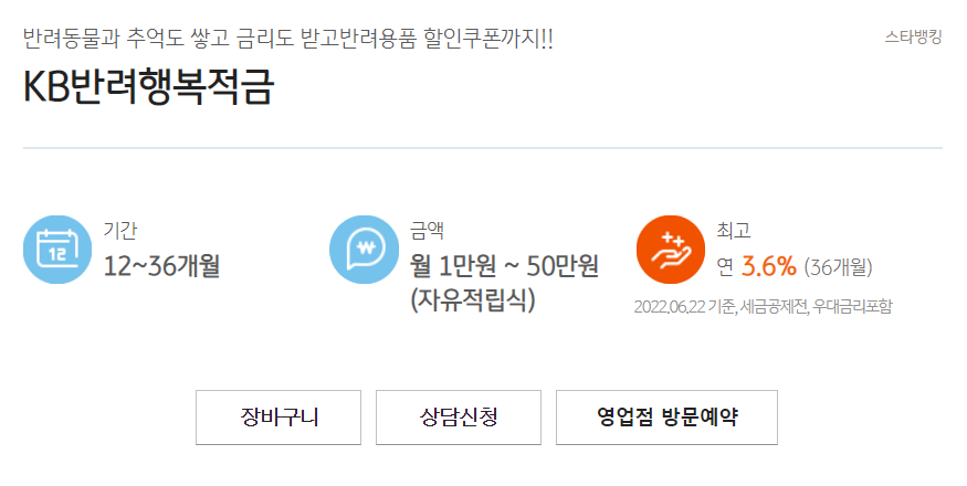 kb반려행복적금은 스마트폰 전용 적금으로 반려동물케어와 입양 정보 등록이 가능 참여형 적금이다. 반려동물정보를 등록하고 우대이율 혜택까지 받으면 연 최대 금리 3.6% 로, 기간은 12개월~36개월, 금액은 월 1만원~50만원 자유적립식 적금이다.