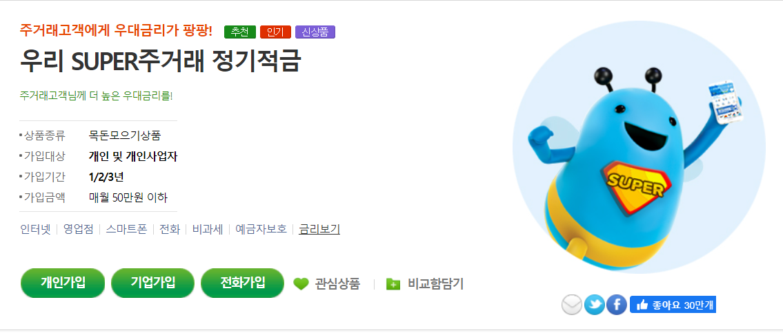 우리 SUPER 주거래 적금 최대 금리는 연 3.65%로 월 50만원씩 36개월 입금이 가능하다. 단 우리은행 첫거래 고객이어야 1.0% 포인트를 받을 수 있고 급여 이체 또는연금 이체 실적, 공과금 자동이체를 지정해야 0.5% 포인트를 우대 받을 수 있다. 또 우리카드를 만들어 결제계좌를 우리은행으로 지정해야 하는 조건도 있으니 참고하시길.