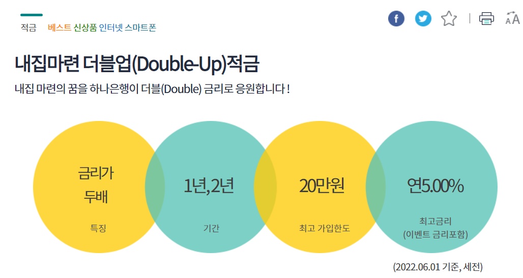 내집마련 더블업적금은 최고 연 5%의 금리우대를 받을 수 있다. 적금 만기 시 주택청약저축을 보유하고 있다면 금리는 2배 오른다. 단 중도 해지시엔 적용되지 않는다. 당초 5.5%였지만 5만좌 한도로 주는 연 3.3%이벤트 특별금리가 종료된 상태이다. 가입기간은 1년 또는 2년 선택 가능하며 금액은 5만원이상 20만원 이하이다.