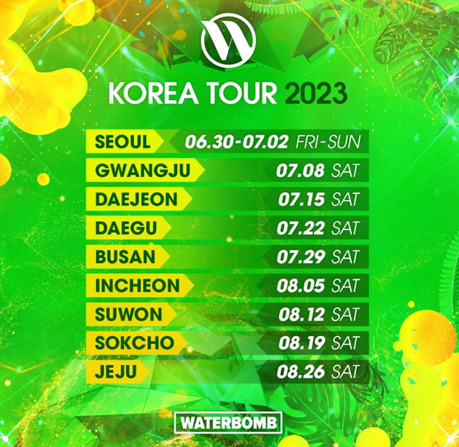 최근 워터밤 공식 홈페이지에서 2023 워터밤 페스티벌 정보가 공개 되었는데 올해 열리는 워터밤 페스티벌은 6월30일~7월2일 서울에서만 3일 진행을 시작으로 광주 (7월8일), 대전(7월 15일), 대구(7월22일), 부산(7월29일), 인천(8월5일), 수원(8월12일), 속초(8월19일), 제주(8월26일) 단 하루씩 만 진행돼요. 장소는 아직 미정이고 공연시간은 540분으로 명시되어 있어요.