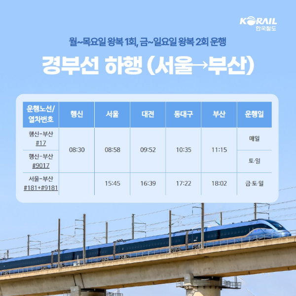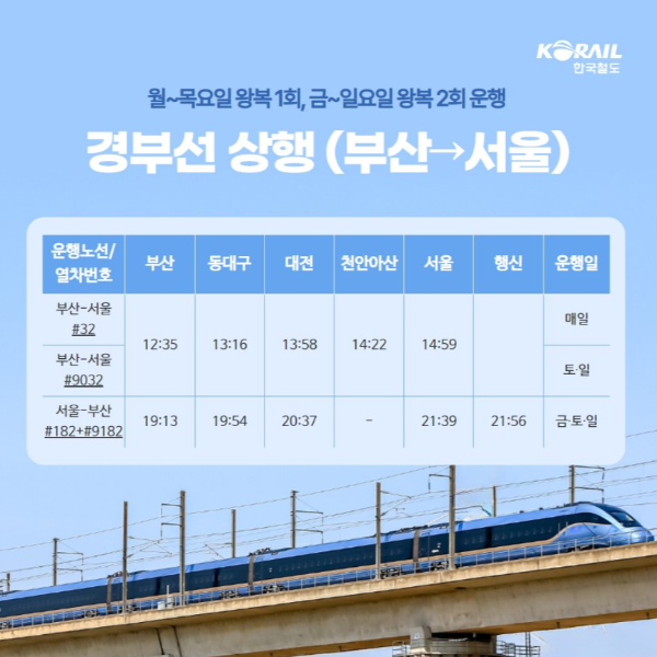 경부선 상행과 하행은 월요일~목요일 왕복 1회, 금요일~일요일 왕복2회 운행한다.