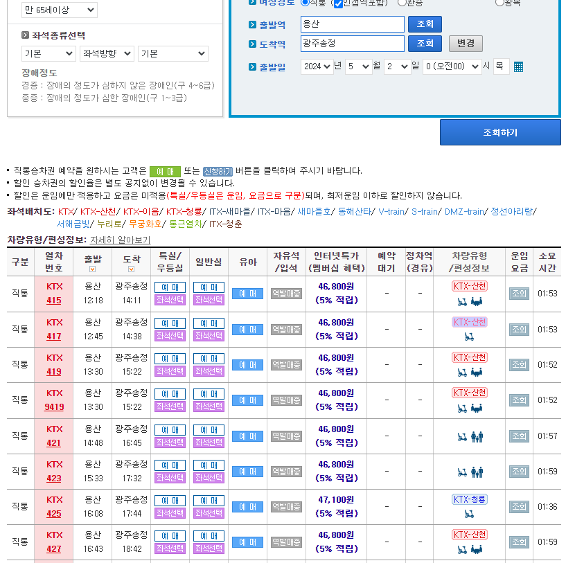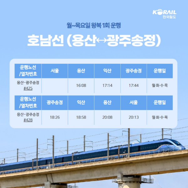 호남선은 용산-광주송정으로 월요일~목요일 왕복 1회 운행한다.