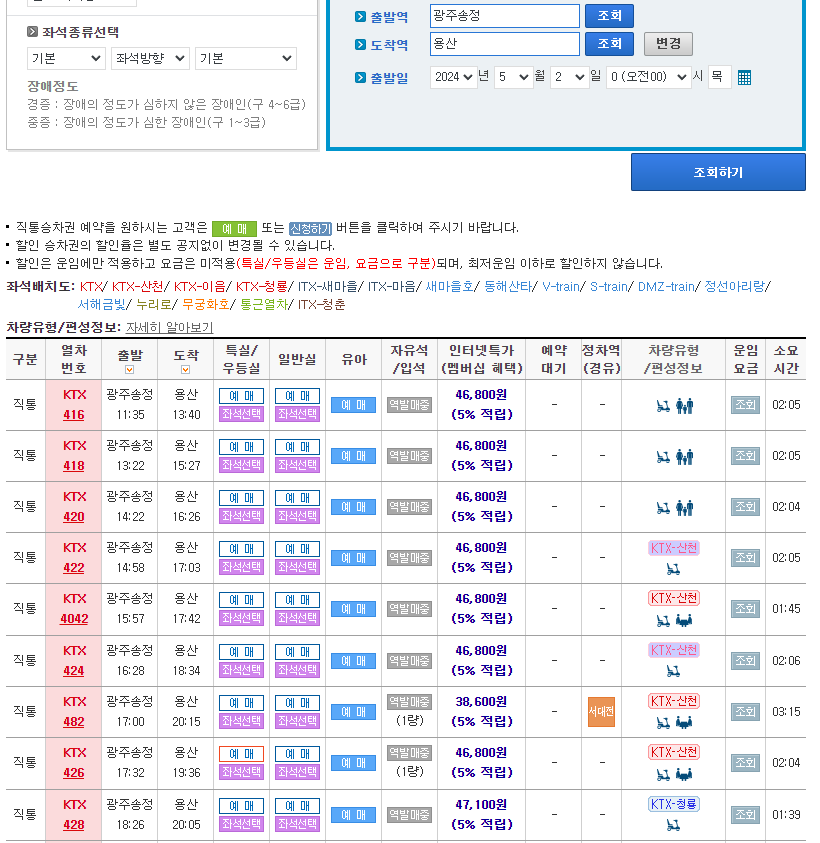 5월 2일 조회 시, 광주송정-용산